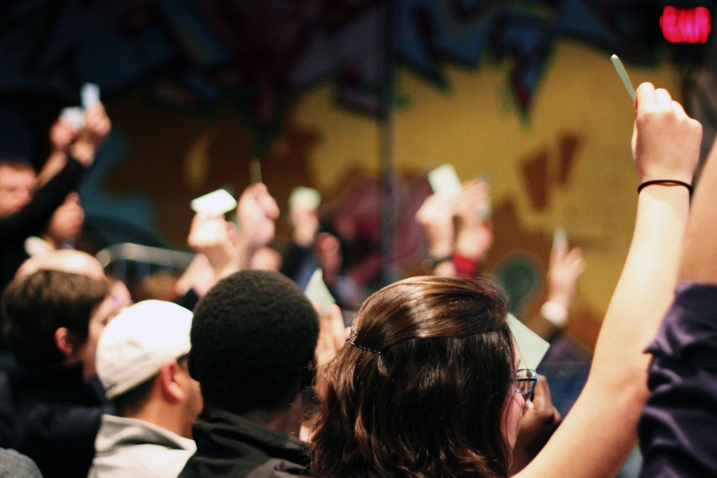 The audience of “cetaceans” uses color-coordinated note cards to indicate how many of them are “dolphin species.”