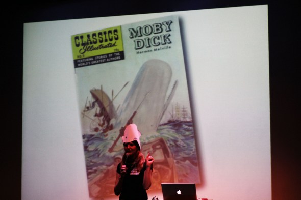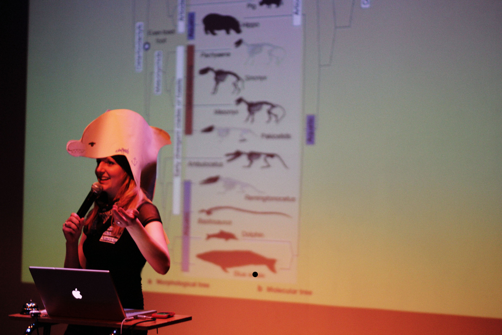 I quiz the audience on their knowledge of dolphin behavior, aided by “Blue Dolphin,” ninja warrior/top scholar.